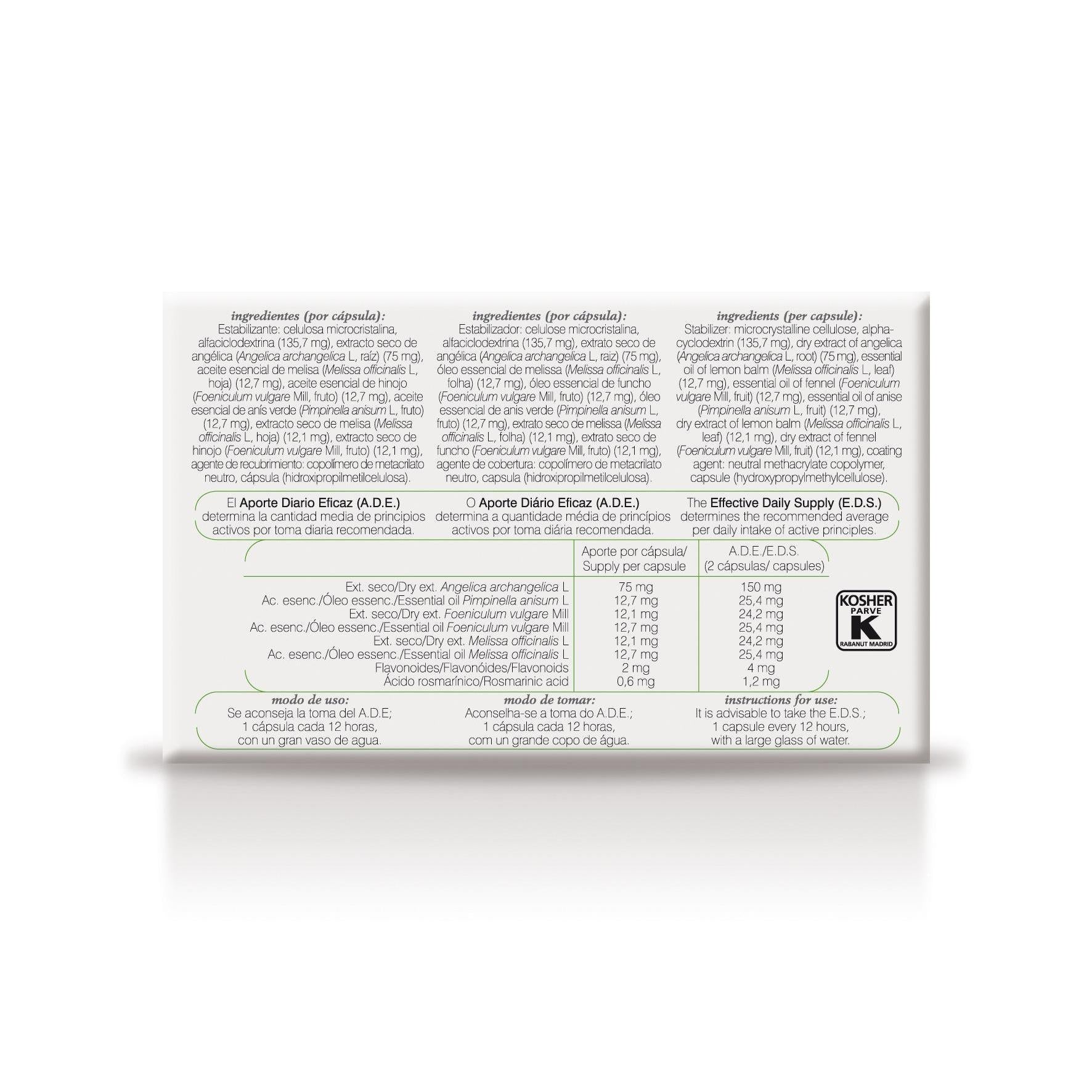 (por cápsula) Estabilizante: celulose microcristalina, alfaciclodextrina (135,7 mg), extrato seco de angélica ( Angélica archangelica L, raiz) (75 mg), óleo essencial de erva-cidreira ( Melissa officinalis L, folha) (12,7 mg), óleo essencial de funcho ( Foeniculum vulgare Mill, fruto) (12,7 mg), óleo essencial de anis verde ( Pimpinella anisum L, fruto) (12,7 mg), extrato seco de erva-cidreira ( Melissa officinalis L, folha) (12,1 mg), extrato seco de funcho ( Foeniculum vulgare Mill, fruto) (12,1 mg) agente de revestimento: copolímero de metacrilato neutro, cápsula (hidroxipropilmetilcelulose).