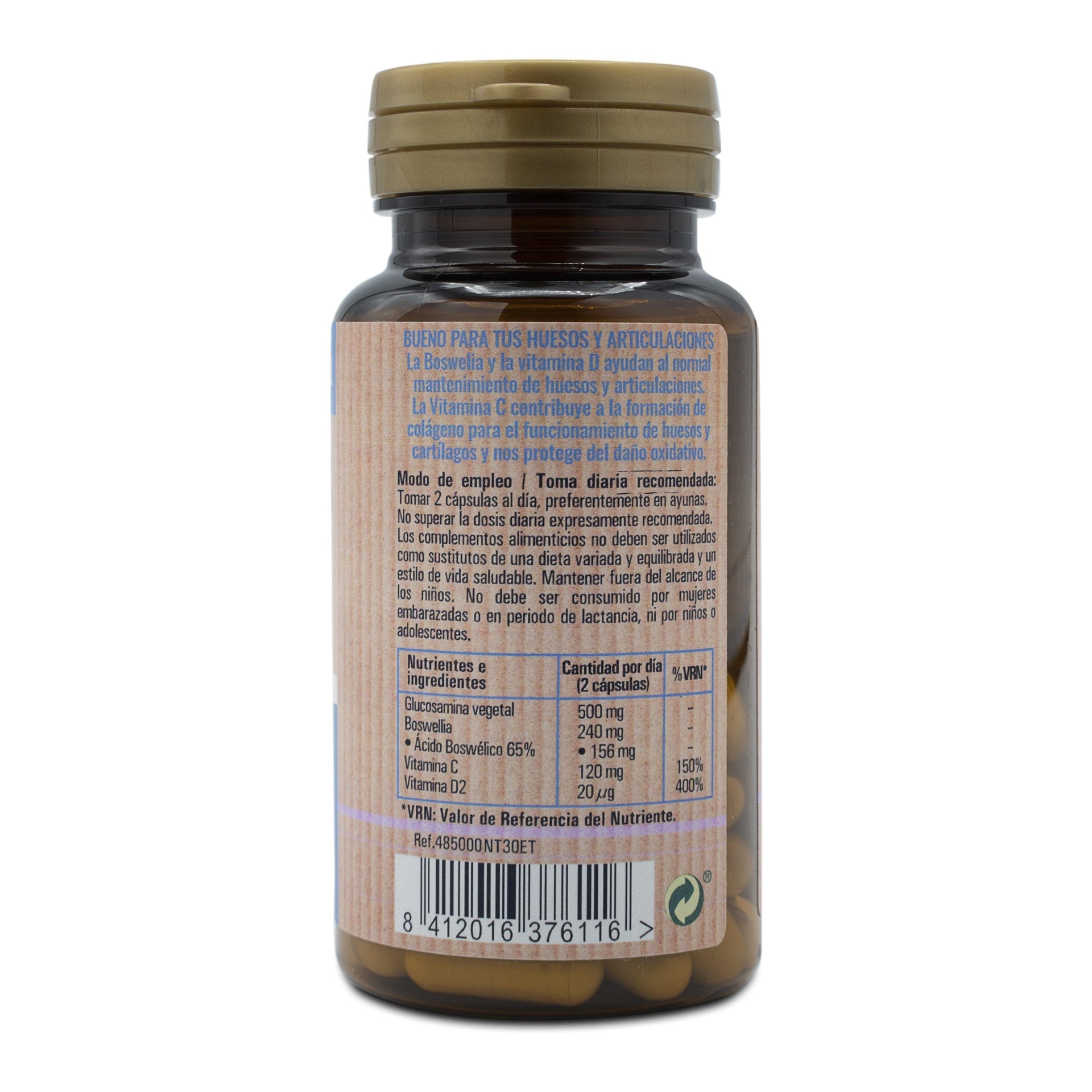 D-Glucosamina (Cloridrato de Glucosamina): 250 mg, Agentes de Volume (Amido de Milho e Celulose), Extrato seco de Boswellia (65% Ácido Boswélico) (Boswellia serrata, resina): 120 mg, Vitamina C (Ácido Ascórbico): 60 mg, Antiaglomerantes (Silicato de Magnésio, Estearato de Magnésio, Dióxido de Silício).