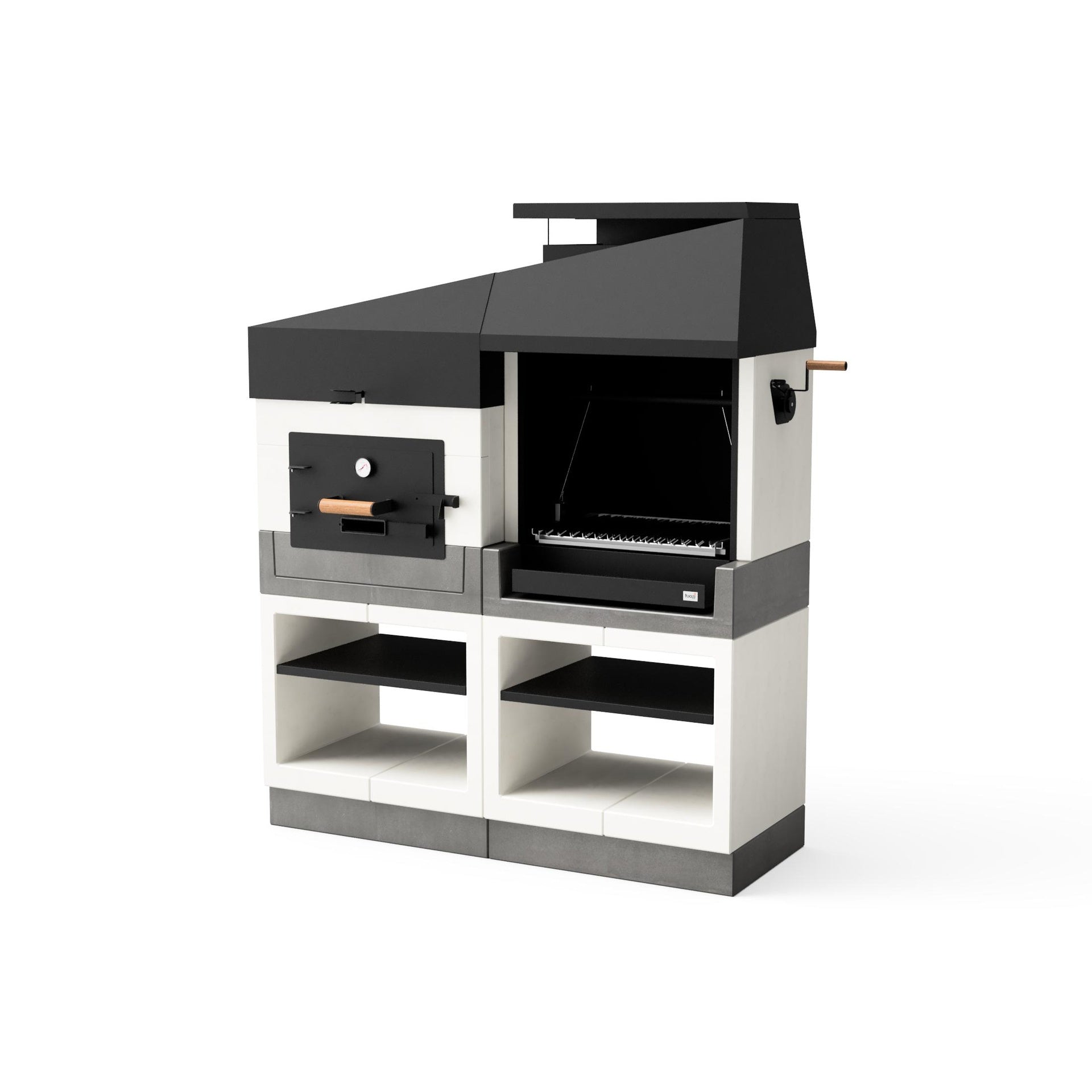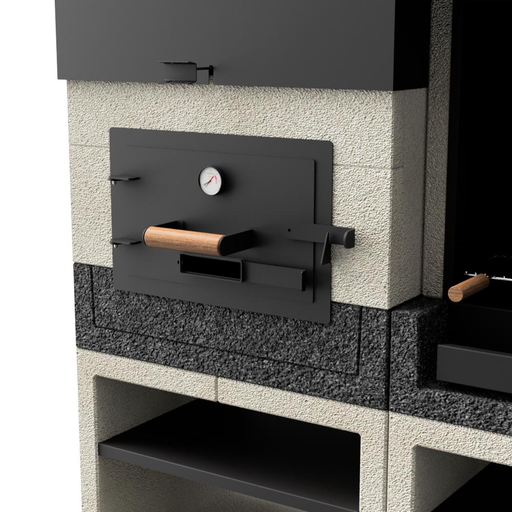 - Forno: Forno de betão e metal. Sistema de exaustão de fumos regulado por válvula de abertura manual. Porta dupla em aço aluminizado. Termómetro para indicação da temperatura interior. Suporte inferior em metal preto. Compatível com todos os produtos e acessórios KITAWAY.
