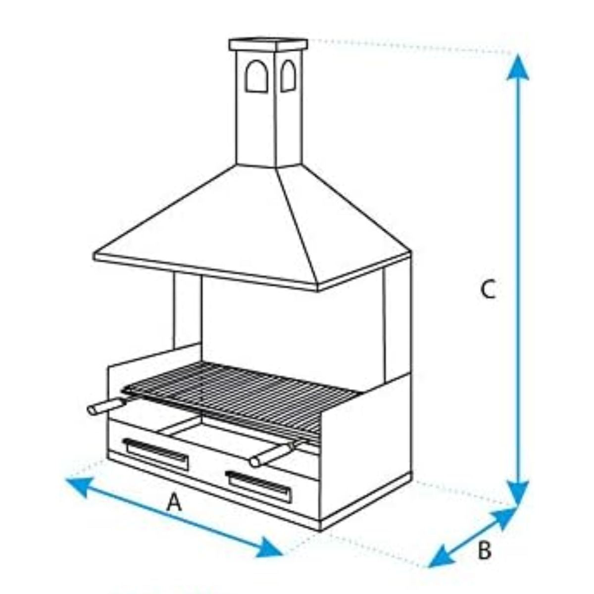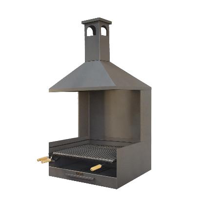 - A grelha em forma de V, ao estilo argentino, com cabos de madeira, canaliza a gordura para a frente, para que não pingue para o carvão.
