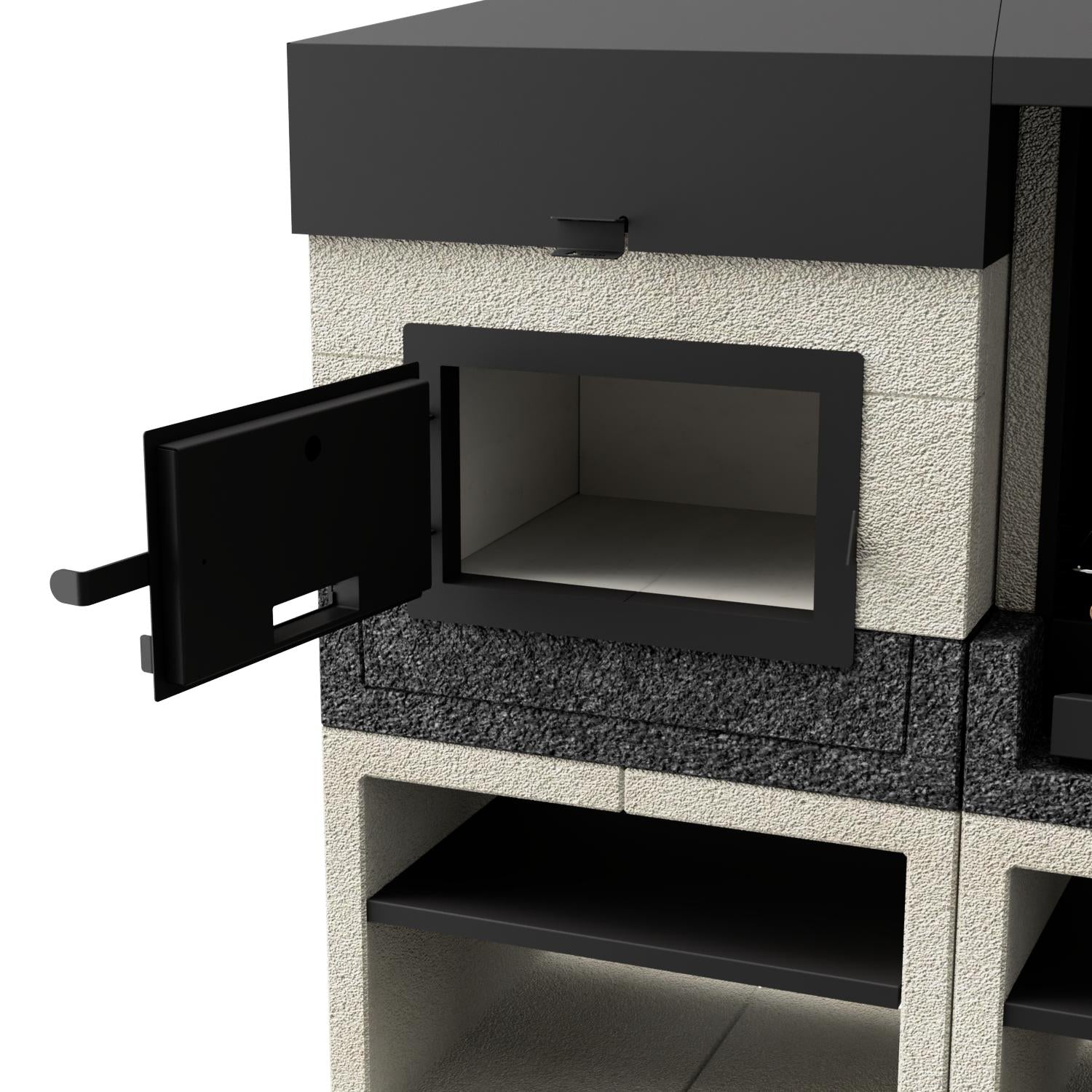- Forno: Forno de betão e metal. Sistema de exaustão de fumos regulado por válvula de abertura manual. Porta dupla em aço aluminizado. Termómetro para indicação da temperatura interior. Suporte inferior em metal preto. Compatível com todos os produtos e acessórios KITAWAY.