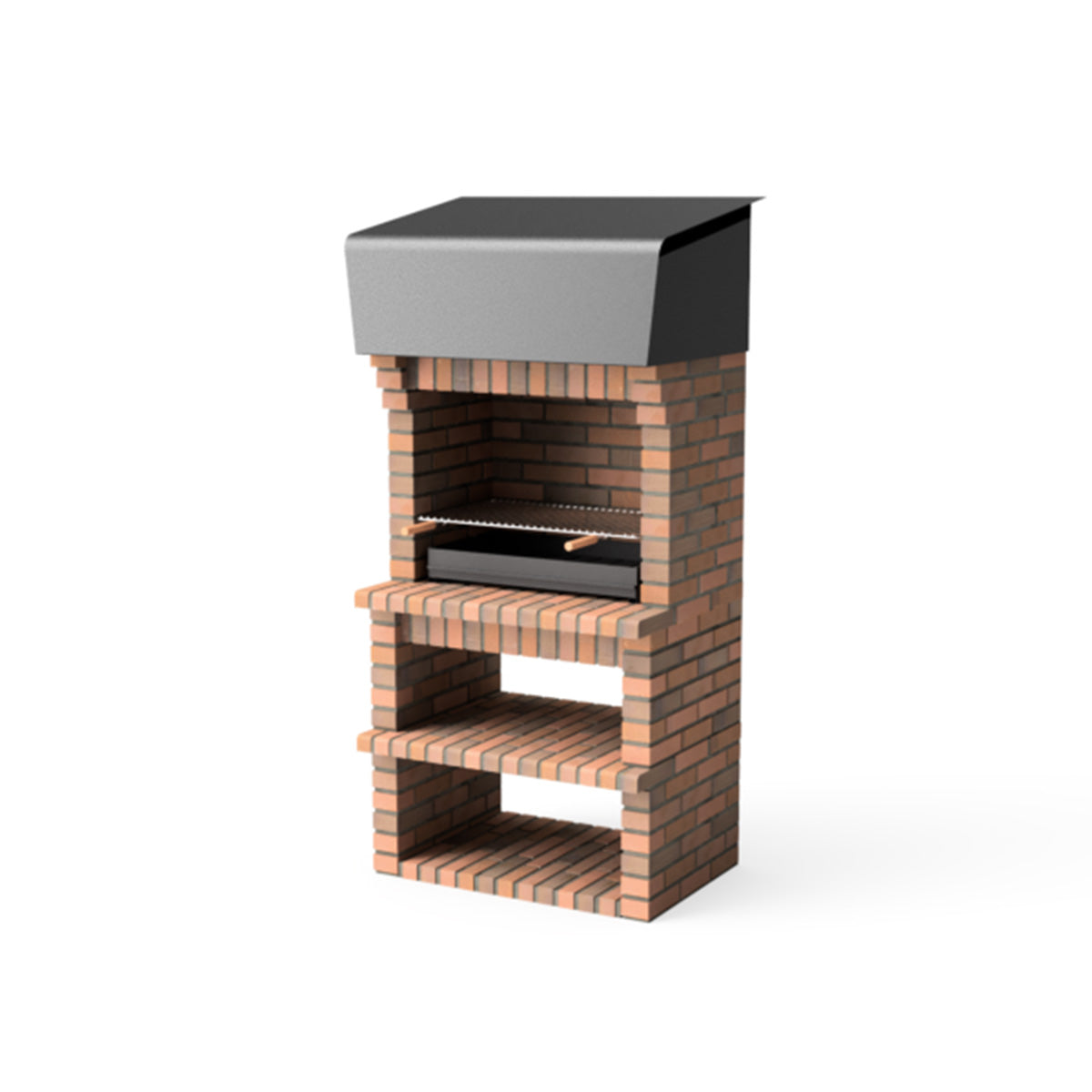 Churrasqueira em betão refractário e tijolo castanho. Grelha em aço inoxidável de 76,5 x 44 cm. Grelha metálica de 70 x 40 cm e gaveta de limpeza.