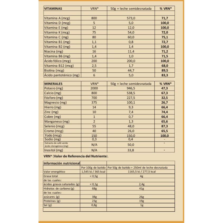 700 g de um batido saciante à base de leite, com todas as vitaminas e minerais recomendados pela IDR, bem como as proteínas, hidratos de carbono e fibras necessários para uma refeição equilibrada, saudável e com poucas calorias. Sem adição de açúcar. Com extrato de café verde. Estes batidos contêm 25% de proteína do leite, vitaminas e minerais.
