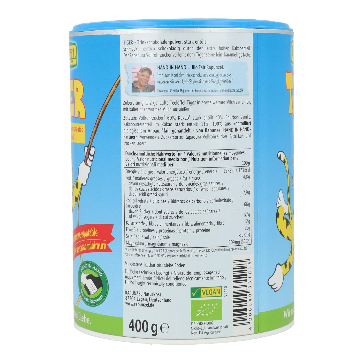 O cacau instantâneo Tiger da Rapunzel contém 40% de cacau em pó com teor reduzido de gordura combinado com açúcar de cana integral Rapadura. É isento de emulsionantes e glúten. É produzido no âmbito dos projetos HAND IN HAND, que apoiam a agricultura biológica e o comércio justo na América Latina, garantindo uma produção responsável e sustentável.