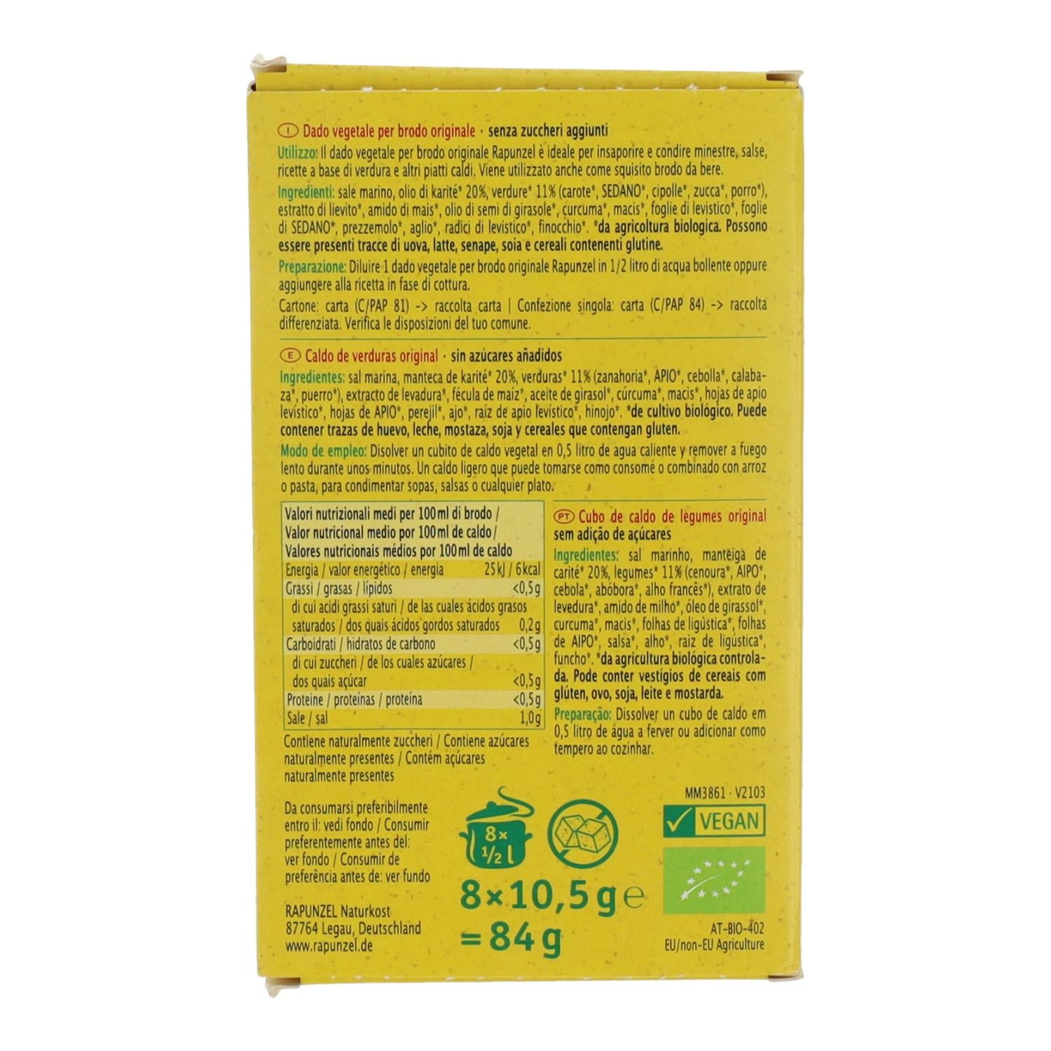 Toda a informação sobre "Cubos de Caldo de Legumes Biológico Rapunzel 84 g"