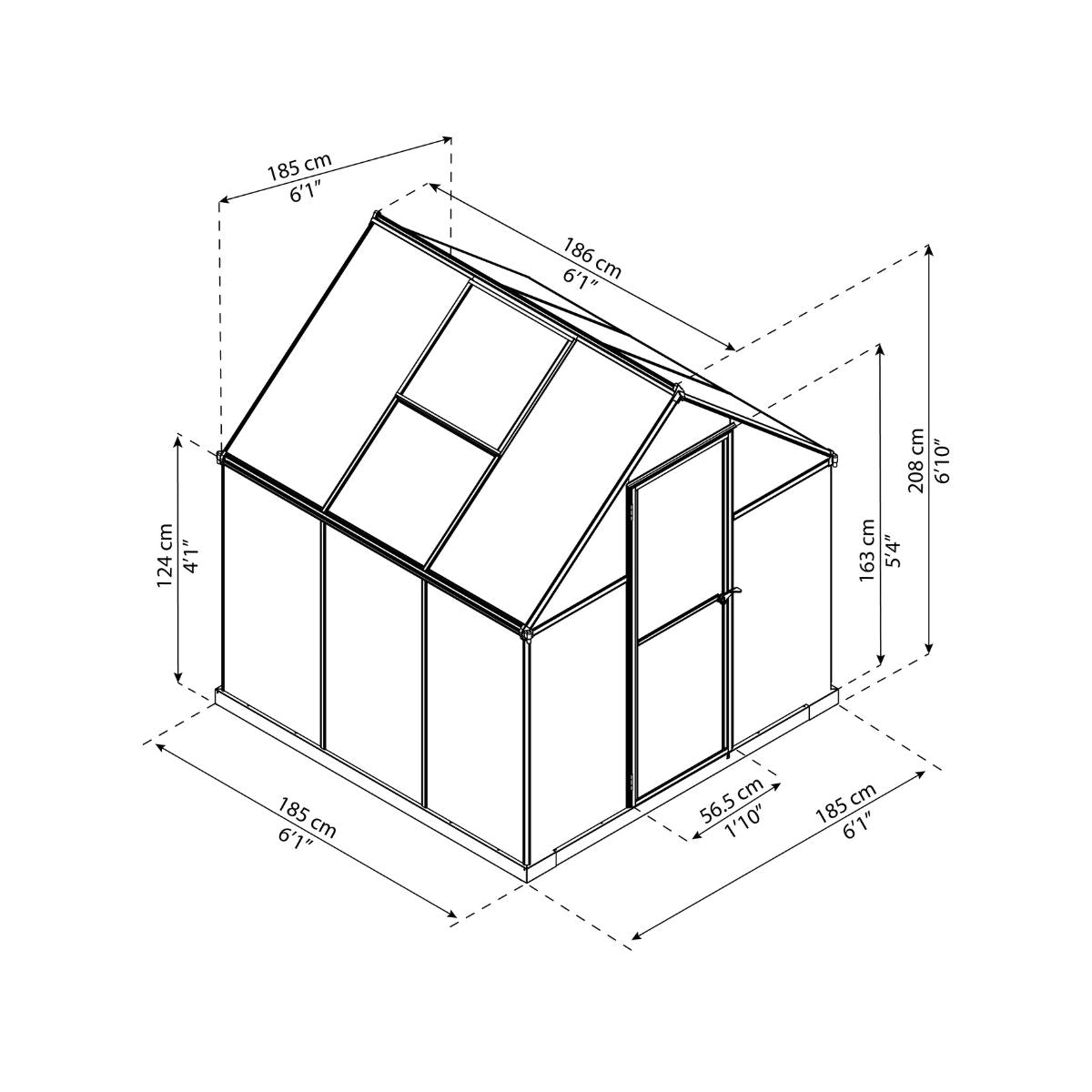 A estufa Mythos™ de 186x185x208 cm da Canopia by Palram é uma solução compacta e durável para quem pretende iniciar ou manter um pequeno pomar ou jardim protegido durante todo o ano. Concebida com uma estrutura em alumínio resistente à corrosão e painéis em policarbonato praticamente inquebráveis, garante durabilidade, segurança e um ambiente de cultivo ideal. O seu sistema de montagem simples e o seu tamanho compacto tornam-na ideal para jardins com espaço limitado.