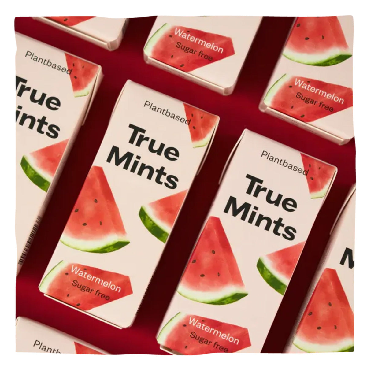 Rebuçados de melancia sem açúcar e sem plástico da True Mint. (13g)