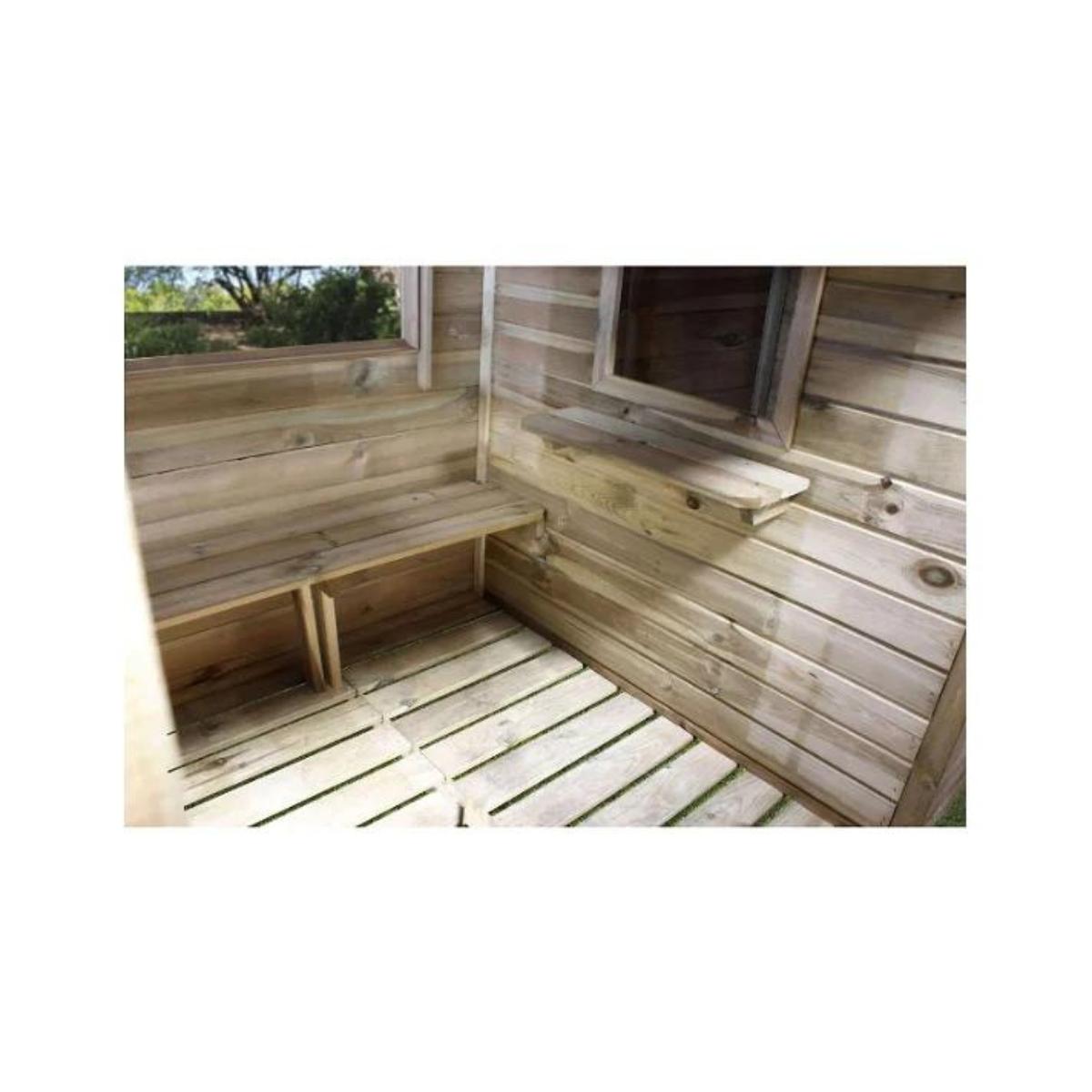Esta cabana de madeira tem ainda um piso, um telhado de feltro betuminoso, uma porta de celeiro e quatro janelas. É adequada para crianças dos 3 aos 12 anos .