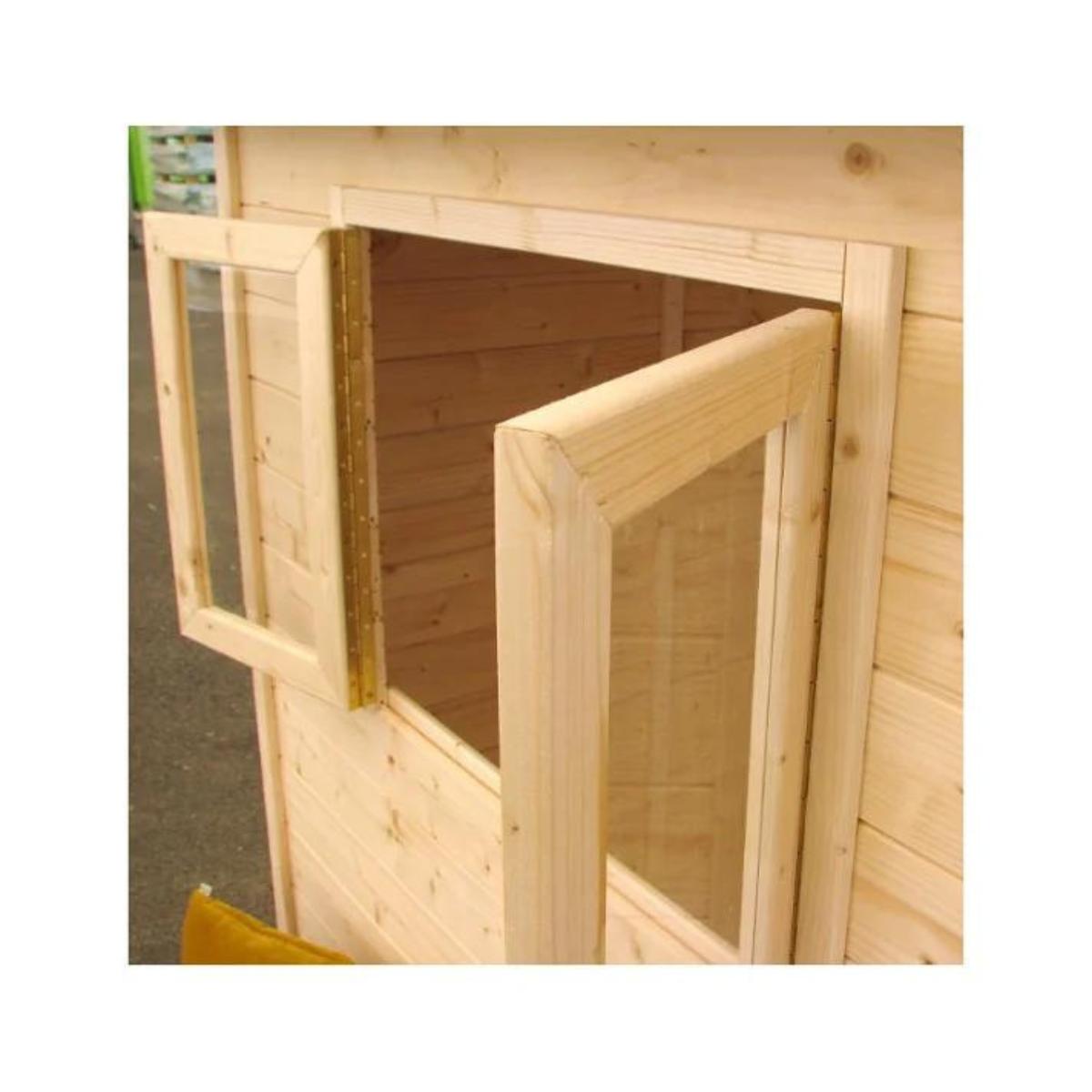 Com telhado de duas águas, esta cabana Sarah possui uma janela em acrílico e uma porta de duas partes que não fecha com o vento graças aos fechos magnéticos. Com uma área interior de 1,35 m² e uma superfície total de 2,89 m², acomoda várias crianças ao mesmo tempo, permitindo-lhes brincar e criar aventuras únicas. Para que os jogadores criativos se possam expressar, dois quadros negros complementam este conjunto de brinquedos para áreas exteriores SOULET.