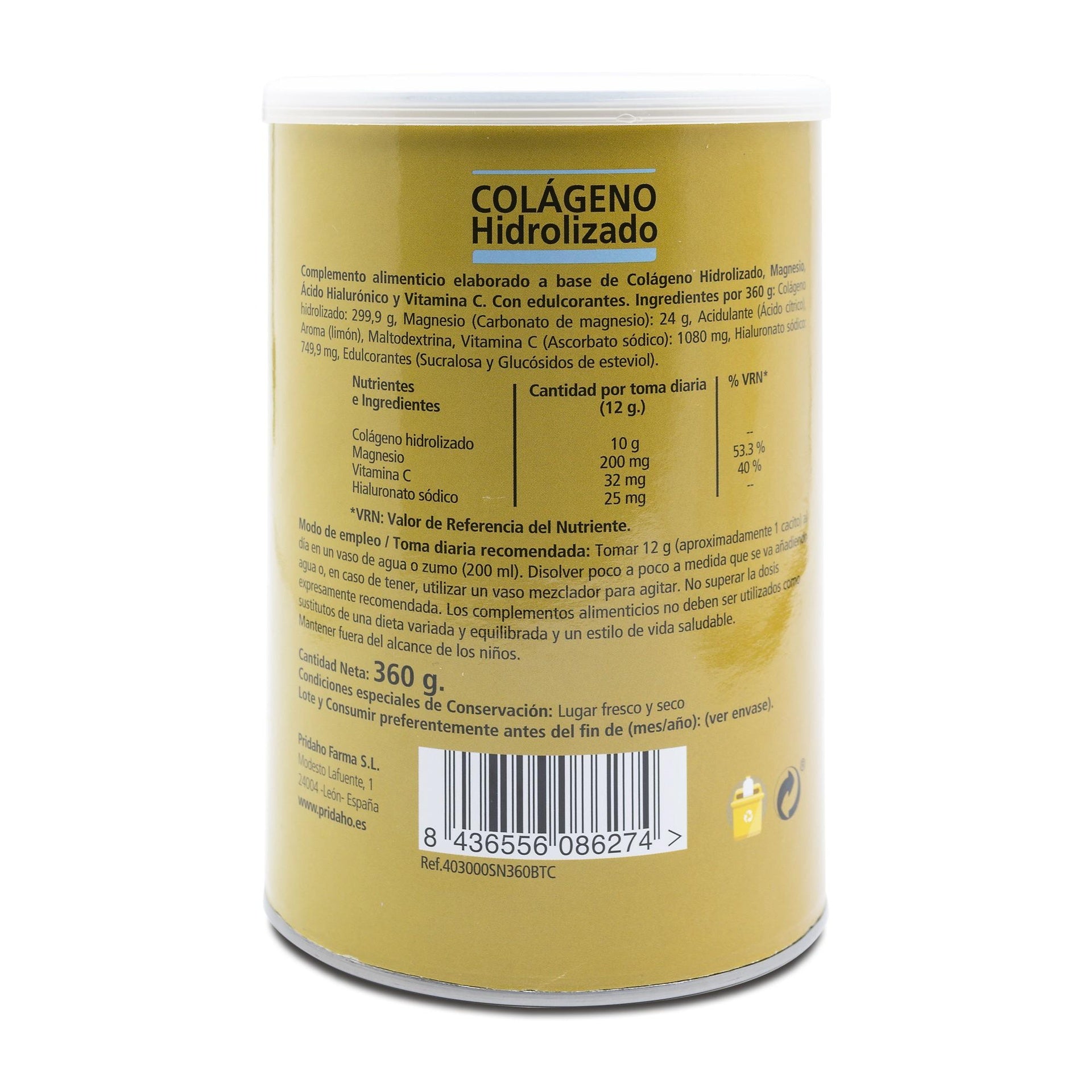 Suplemento alimentar à base de colagénio hidrolisado, magnésio, ácido hialurónico e vitamina C. Conteúdo líquido: 200 g de pó. Embalado em lata com colher de medida. Condições especiais de armazenamento: Conservar em local fresco e seco, protegido da luz.