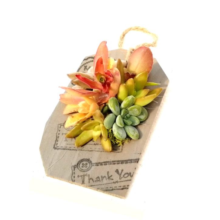 Composição feita com mudas de plantas suculentas de diferentes variedades e cores num rótulo de madeira natural.