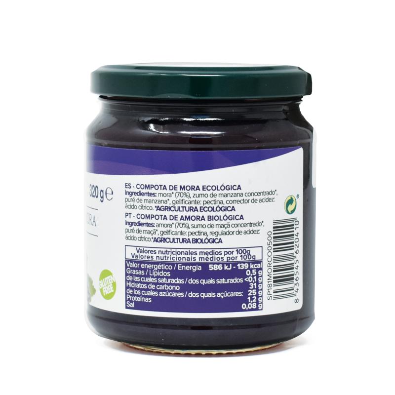 Compota de amora silvestre de agricultura biológica certificada. Obtida pela fervura da fruta e misturada com concentrado de maçã. Com um mínimo de 60-70% da melhor fruta. Doce cremoso ideal para o pequeno-almoço ou lanche. Também perfeita para sobremesas. Sem adição de açúcar.