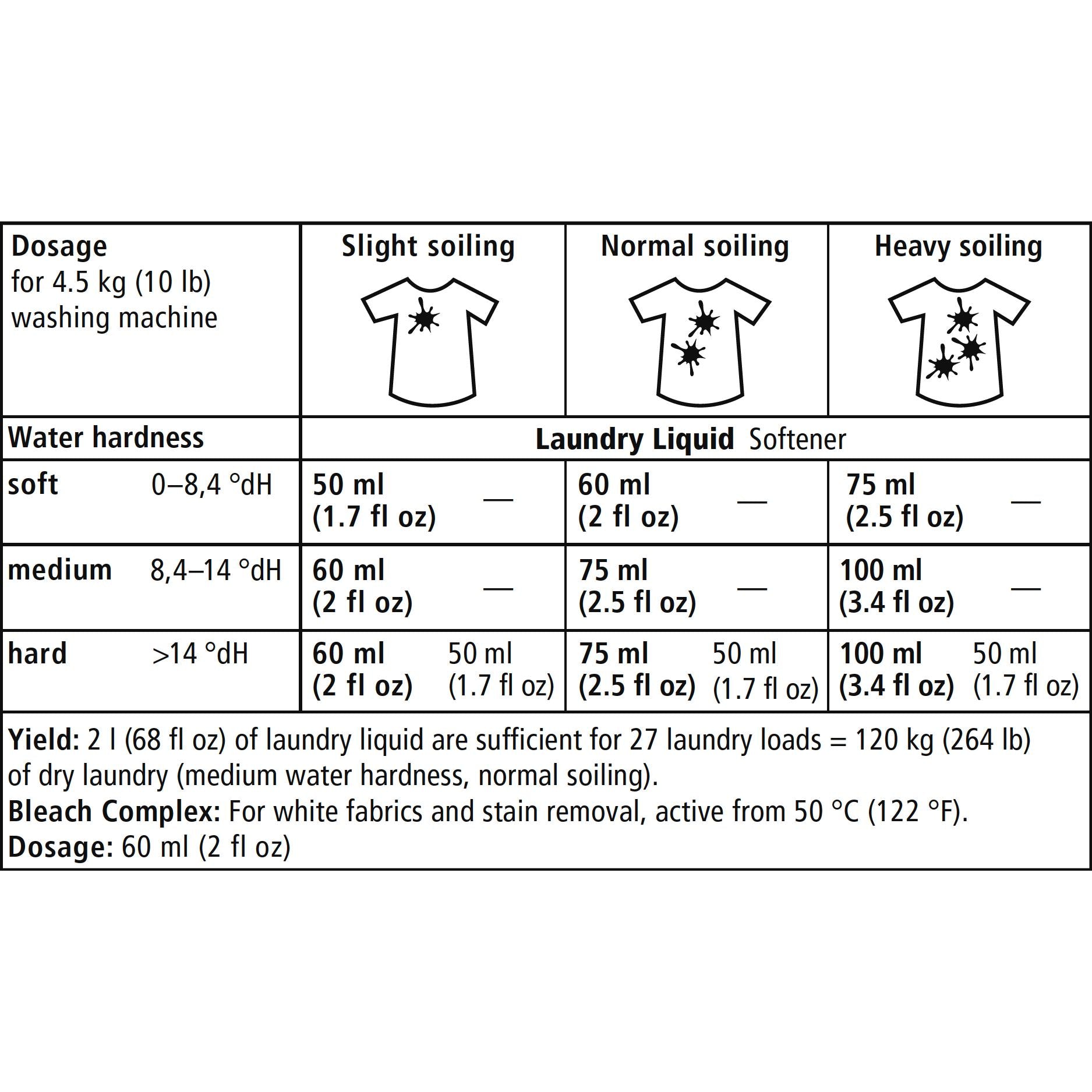 - Lavagem à máquina: Dosagem de acordo com a dureza da água e o grau de sujidade, normalmente entre 30 a 60 ml por lavagem.