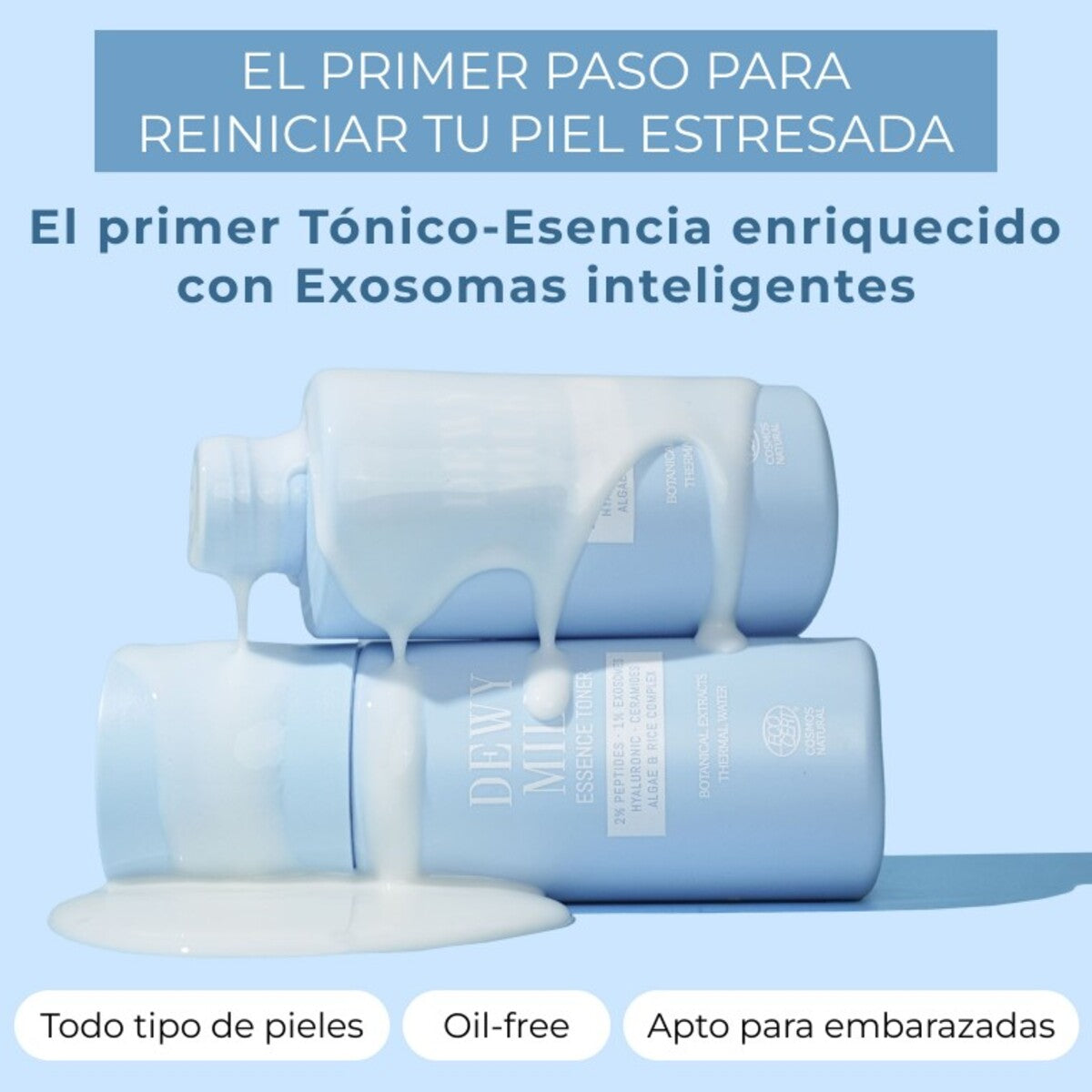 Dewy Milk Essence Toner es un tónico lechoso de textura ligera y oil-free que actúa como primer paso en la rutina facial para pieles +40 años o como hidratante único para pieles jóvenes.