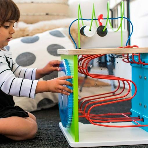 Este cubo de atividades em madeira permitirá que a criança experimente múltiplas atividades realizando diferentes experiências em movimento. Possui diversas atividades para estimular os sentidos do Pequeno. Características: - Labirinto de contas no topo Magnético flutuante e engrenagens. - Bola labirinto com efeito espelho - Labirinto de diapositivos de animação