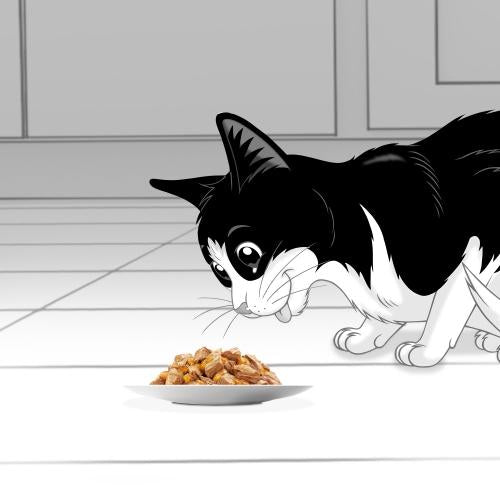 Para um gato adulto médio (4 kg), sirva 3 a 4 saquetas por dia, em pelo menos 2 refeições separadas.