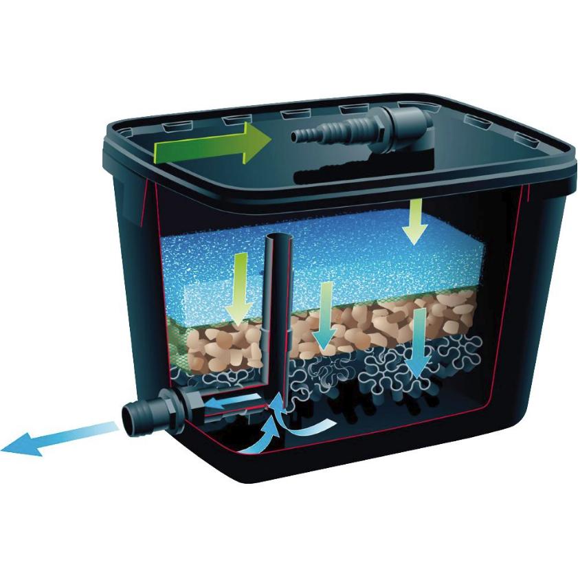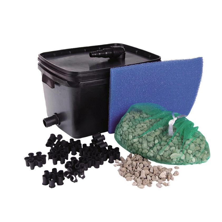 Modelo 2000. Contém esponja filtrante, rede com grânulos filtrantes, conjuntos de peças biológicas e ligações.