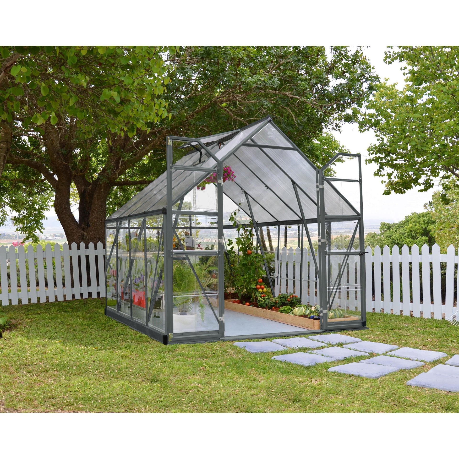• Painéis de cobertura em policarbonato de parede dupla: os painéis de cobertura com 4 mm de espessura oferecem proteção contra a luz solar intensa e prolongam a estação protegendo as plantas das geadas de outono.