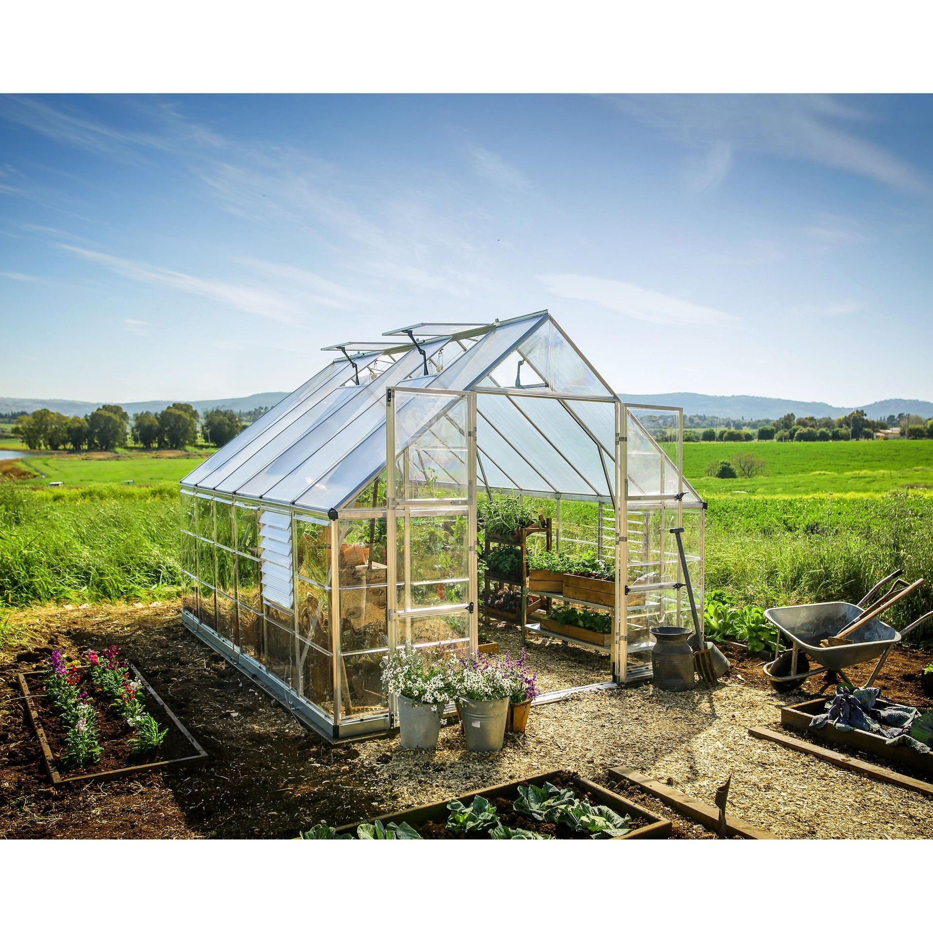 Com dois tipos de envidraçados, terá uma estufa DIY bem equilibrada que combina a proteção dos painéis de teto de parede dupla difusa com a transmissão de luz dos painéis de parede cristalinos, proporcionando condições de cultivo ideais. Todos os painéis são fabricados em policarbonato com proteção UV, um polímero de alta qualidade e praticamente inquebrável, ideal para estufas.