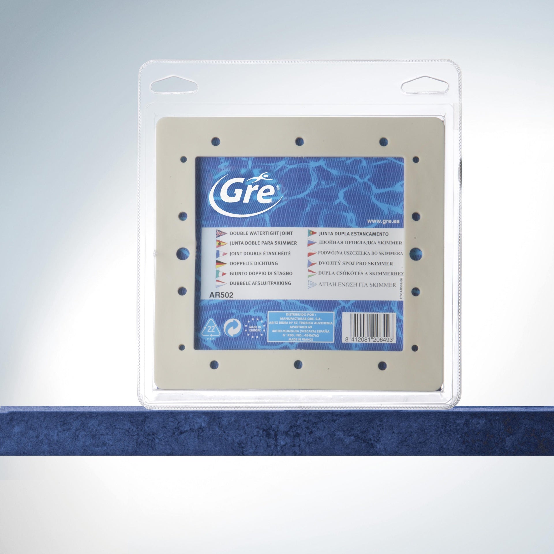- Junta de vedação dupla para skimmers Gre na cor branca, para renovar a junta em caso de desgaste ou fuga de água.