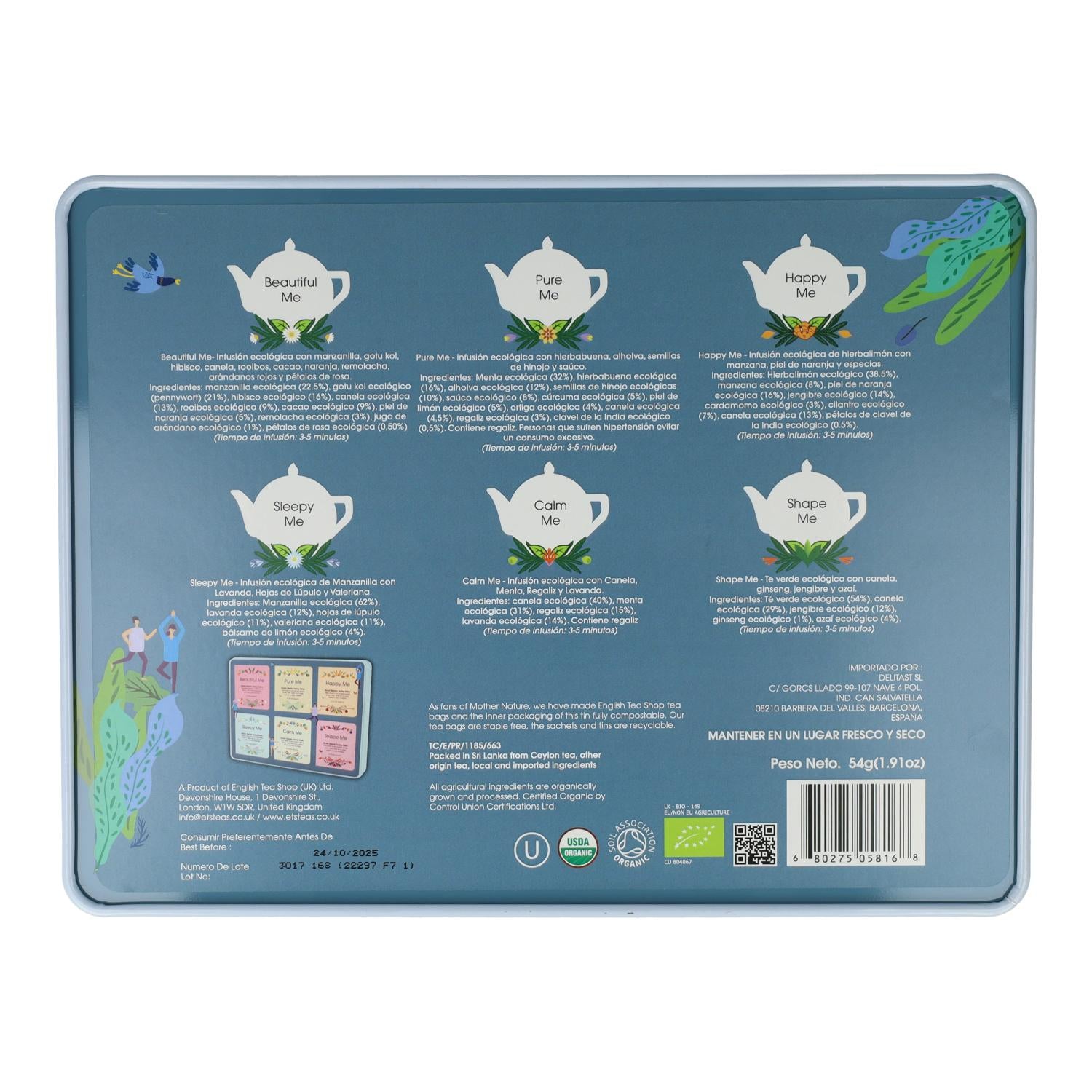 Uma coleção de seis variedades de chás de ervas numa bonita lata para oferecer. Contém: Beautiful Me, Pure Me, Happy Me, Sleepy Me, Calm Me e Shape Me. Chás de ervas de origem biológica.
