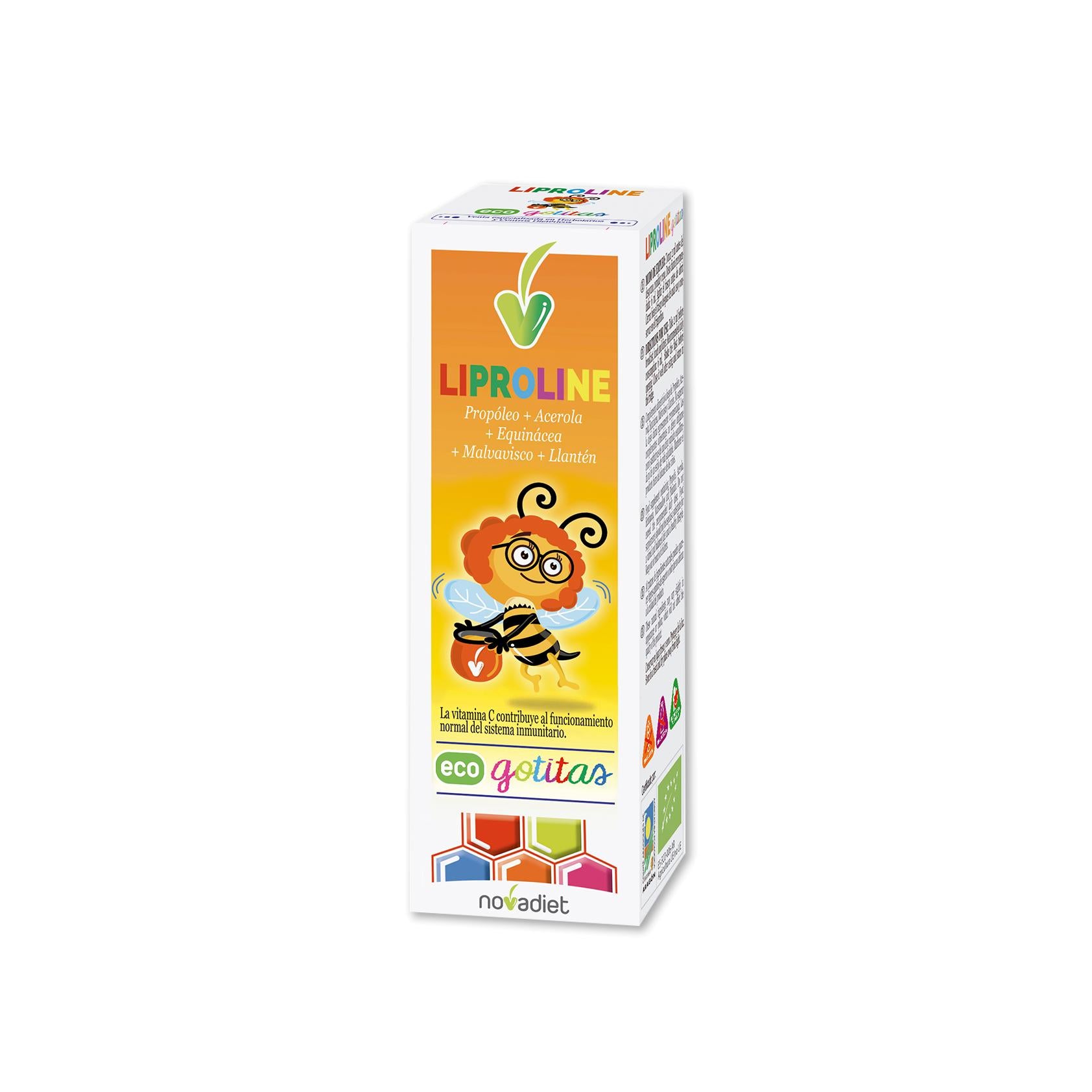 As gotas ecológicas de Liproline da Novadiet são um suplemento alimentar natural e orgânico desenvolvido para fortalecer o sistema imunitário das crianças a partir de 1 ano de idade. A sua fórmula combina própolis com plantas como a equinácea, a malva-rosa e a tanchagem, bem como a vitamina C da acerola, para aliviar os sintomas de gripes e constipações e reduzir as dores de garganta e a tosse.