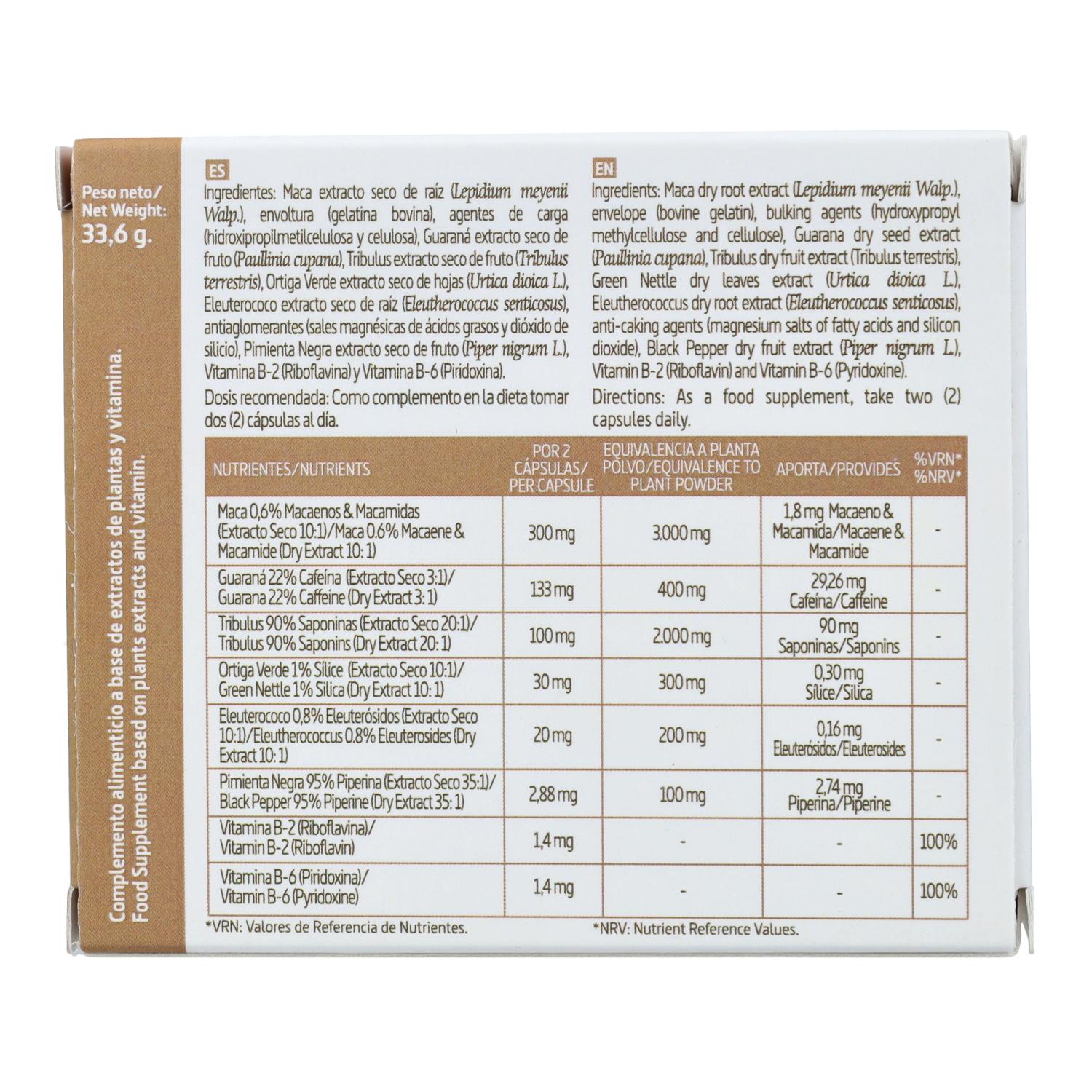 Extrato de maca 150 mg, agente de volume (hidroxipropilmetilcelulose e celulose vegetal), extrato seco de guaraná 66,5 mg, extrato seco de tribulus 50 g, extrato seco de urtiga verde 15 mg, extrato seco de eleutherococcus 10 mg, antiaglomerante (estearato de magnésio vegetal e dióxido de silício), extrato seco de pimenta preta 1,44 mg, vitamina B2 0,7 mg, vitamina B6 0,7 mg, invólucro (gelatina)