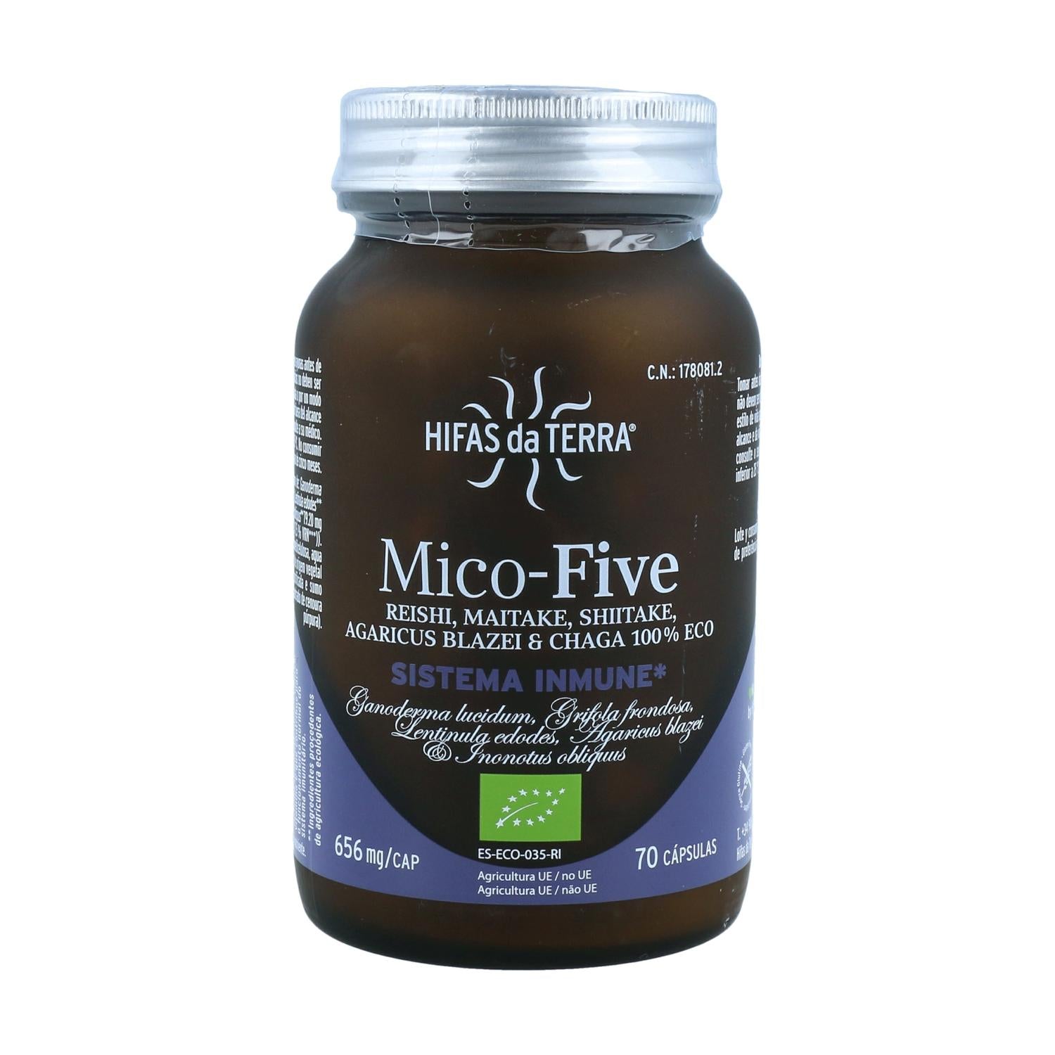 O Mico Five da Hifas da Terra é um suplemento alimentar que incorpora Chaga ( Nonotus obliquus ) nos seus produtos, acrescentando simultaneamente as propriedades da grande pérola do norte. O novo Mico Five +C é mais potente, tanto pela sua concentração (proporção 12:1) como pela variedade de substâncias bioativas.
