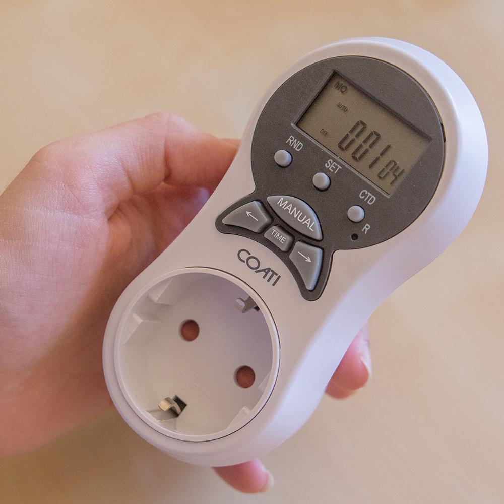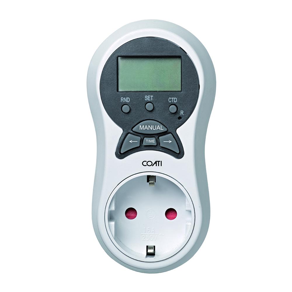 Um temporizador semanal digital compacto com acabamento em grafite. O temporizador COATI tem 20 programas com 15 combinações semanais à escolha e um intervalo de comutação de 1 minuto. Oferece ainda uma série de funções adicionais, como contagem decrescente para o funcionamento dos dispositivos ligados, função aleatória para simular a presença em casa durante as férias, função de verão para adaptar rapidamente a hora à nova programação, função de reinicialização e função de 12/24 horas para alterar o formato da hora.