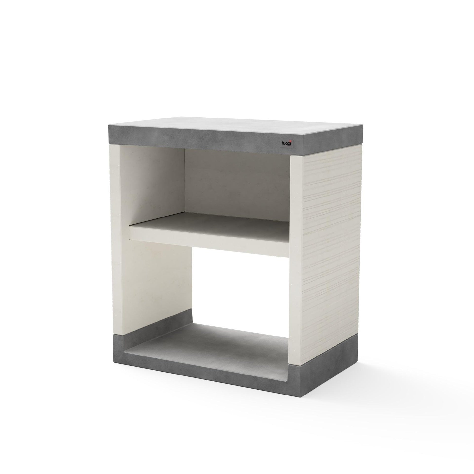 - Material: betão branco e cinza