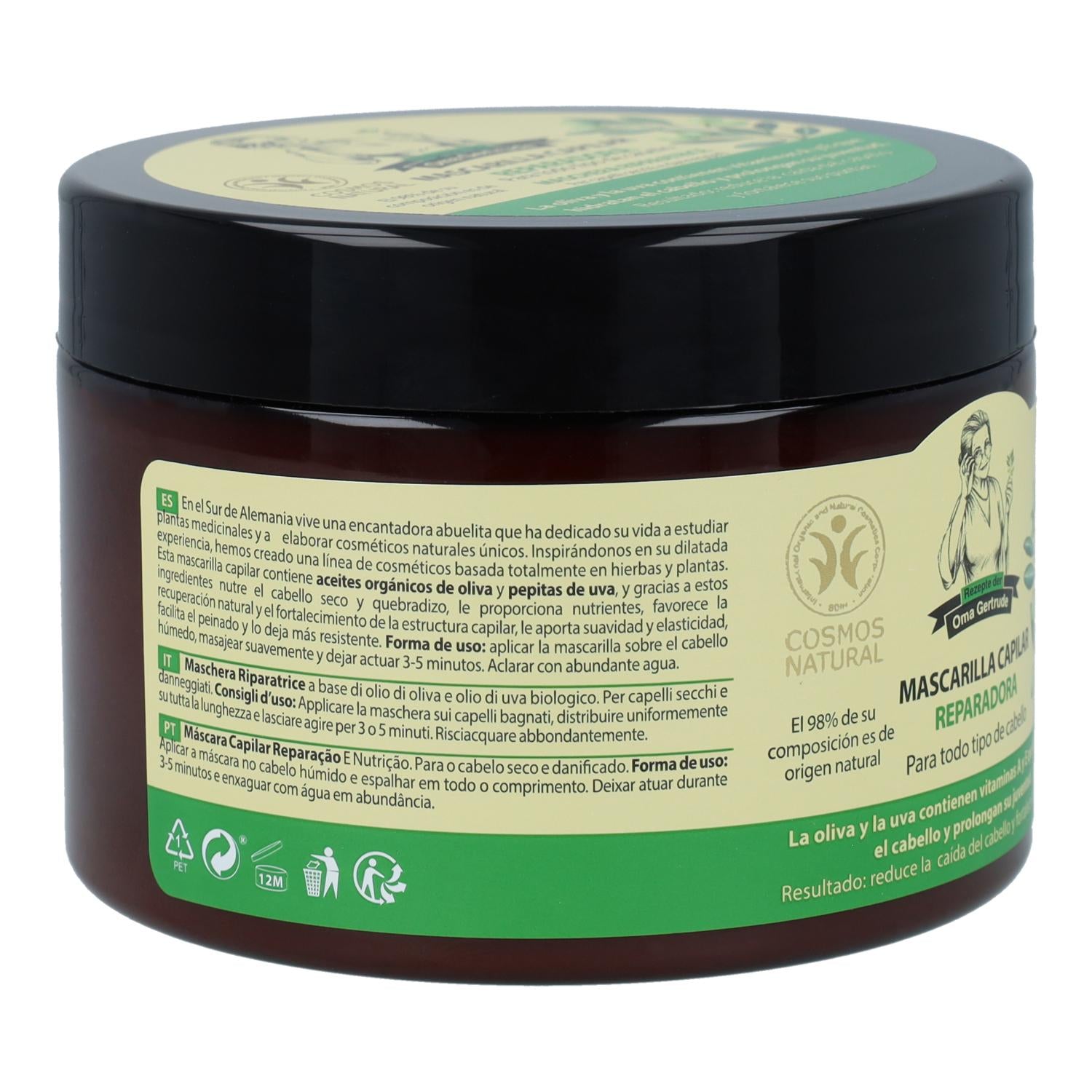 Toda a informação sobre "Embalagem de 2 máscaras capilares para reparação e nutrição de cabelos secos e danificados, Oma Gertrude, 300 ml"