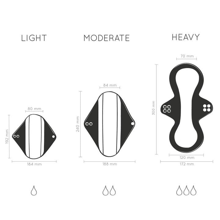 Os pensos reutilizáveis Bambaw são feitos por mulheres para mulheres, garantindo que satisfazem todas as suas necessidades de higiene feminina. Por isso, estão disponíveis em três tamanhos diferentes: