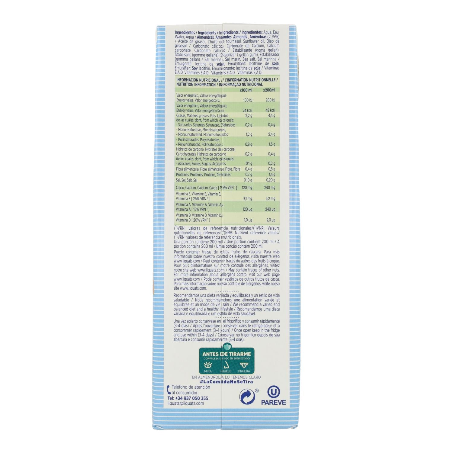 Ingredientes: Água Montseny, amêndoa (2,75%), óleo de girassol, carbonato cálcio, goma gelana, emulsionante: lecitina de girassol, sal marinho, Vitaminas A, D e E. Alergénios: Amêndoa, pode conter vestígios de soja e/ou outros frutos secos