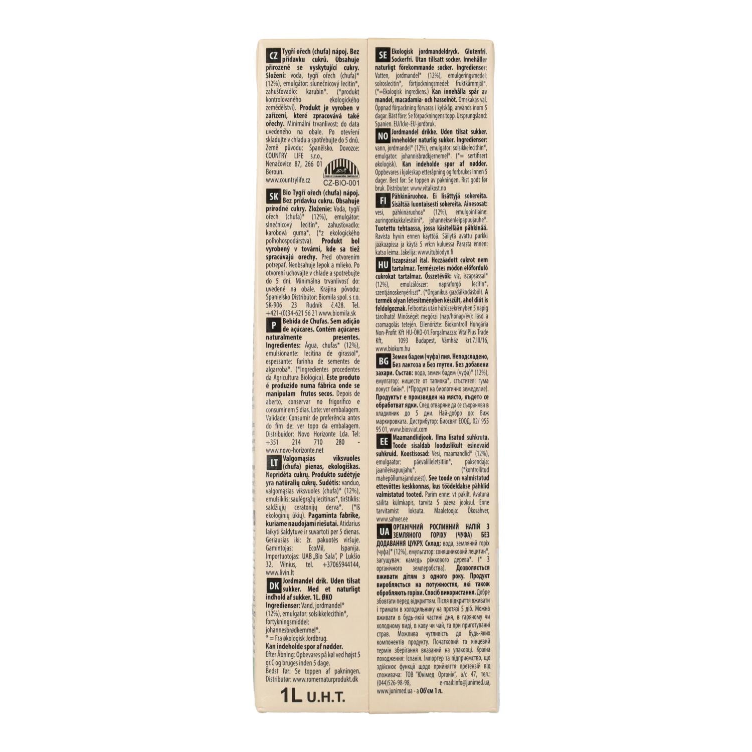 Água, chufas* (12%), emulsionante: lecitina de girassol*, espessante: farinha de sementes de alfarroba* Este produto é fabricado numa instalação onde as nozes são manipuladas
