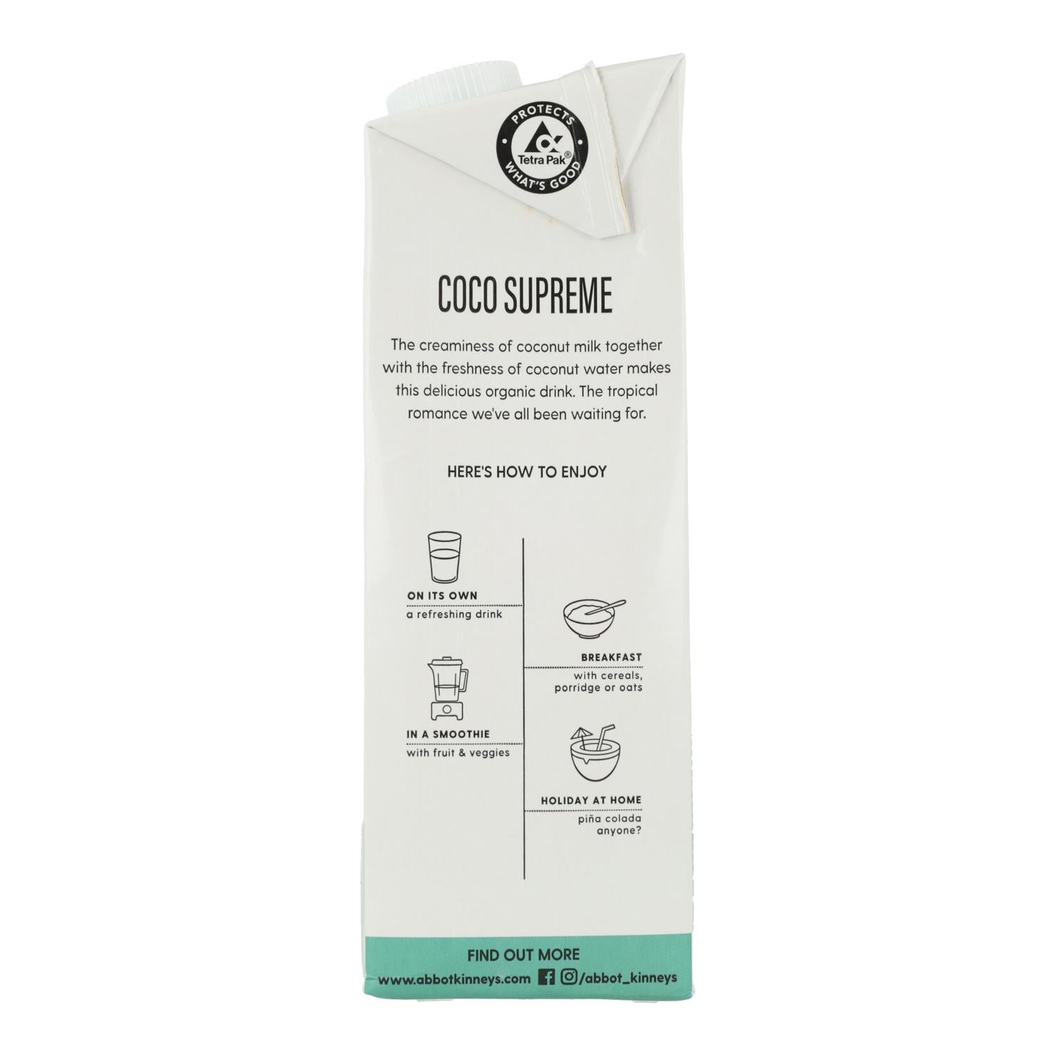 Toda a informação sobre "Embalagem de 6x Bebida Vegetal Supreme de Coco Bio Abbot Kinney 1L"