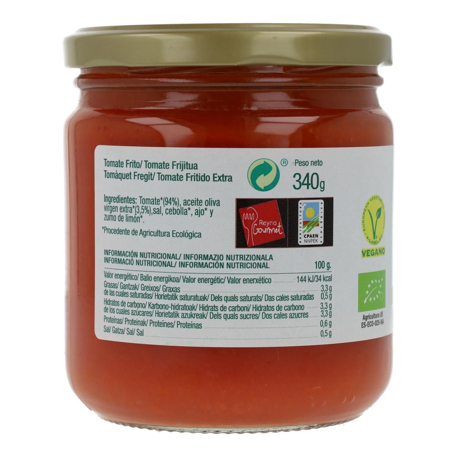Tomate Frito BIO Casero Sin Azúcar, solo tiene tomate, aceite de oliva virgen extra, sal, cebolla, ajo y un poco de zumo de limón ecológico para preservar el tomate de la forma más natural.