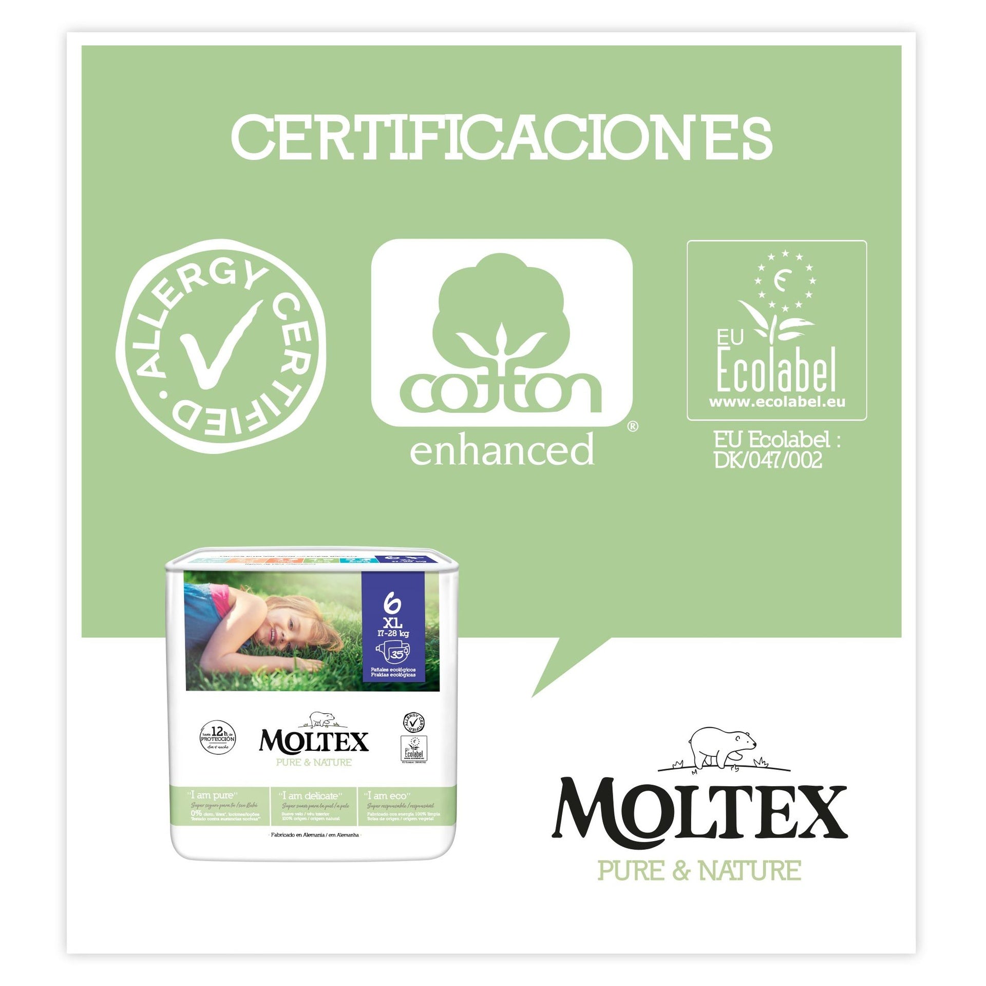 Toda a informação sobre "Fraldas Moltex Pure & Nature T6 Embalagem Económica (17-28 kg), 140 Unidades"