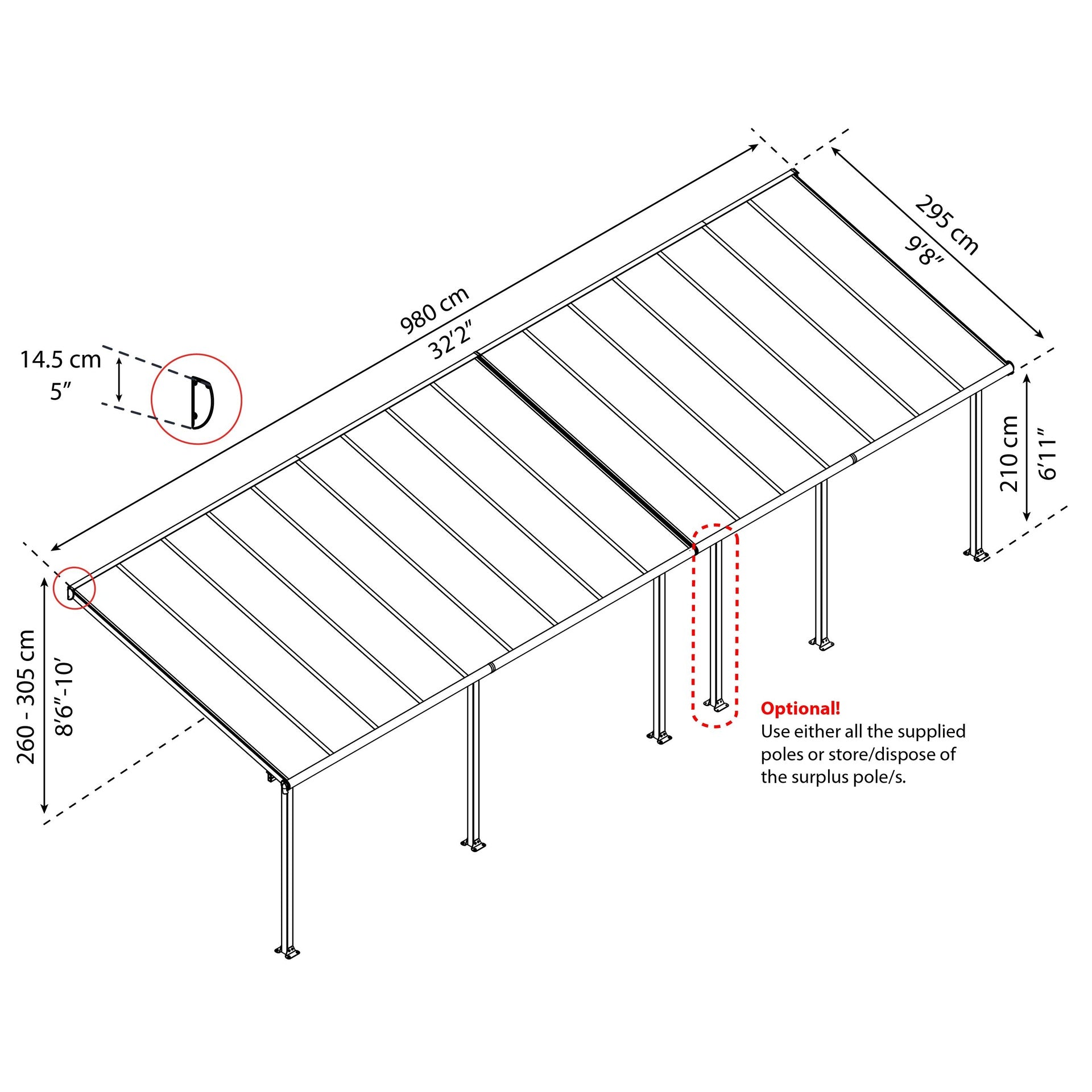 A cobertura para pátio Olympia foi concebida a pensar no seu conforto: seja para receber visitas, celebrar eventos familiares especiais ou simplesmente relaxar no seu spa exterior. Oferece o ambiente ideal para desfrutar do seu jardim e relaxar ao final do dia. A Olympia é robusta, resistente e durável, com uma estrutura em alumínio com revestimento em pó resistente à corrosão e painéis de teto em policarbonato multicamadas, difusores de luz e praticamente inquebráveis, com 100% de proteção UV.  • Concebido para suportar condições climatéricas adversas, cargas de neve pesadas e ventos fortes