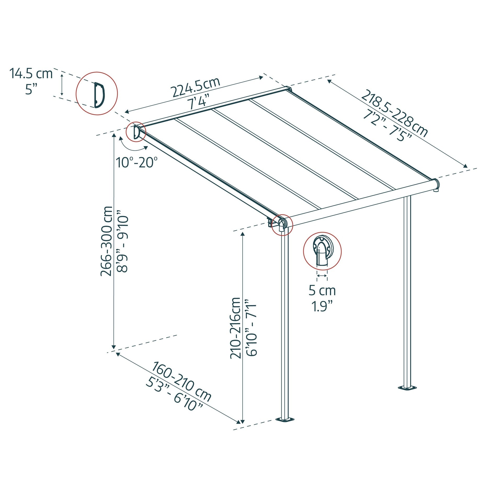 A Sierra é uma estrutura robusta e flexível que permite definir a altura desejada na ligação da parede, a distância da casa e a distância entre os postes ovais na parte da frente. Foi concebida para ser facilmente montada por duas pessoas, com o sistema de painéis deslizantes a garantir uma montagem segura e fácil; não requer experiência, competências especiais ou ferramentas especiais. A Sierra proporcionará à sua família um espaço de convívio ao ar livre elegante, robusto e à prova de ferrugem durante muitos anos.