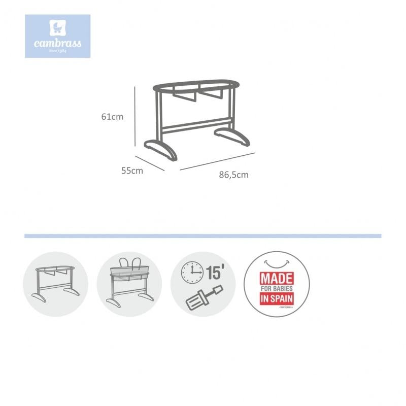 O berço de madeira Cambrass sem rodas serve tanto no berço Cambrass como noutros berços de tamanho semelhante. É feito de madeira, lacado a branco, e a sua altura permite que o adulto veja o bebé a todo o momento.