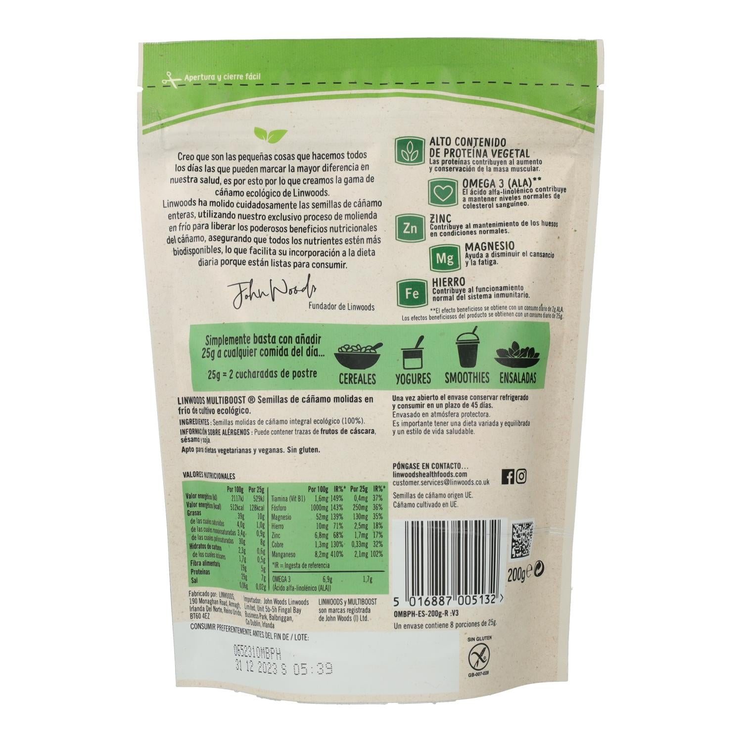 Toda a informação sobre "Sementes de cânhamo moídas biológicas Linwoods 200g"