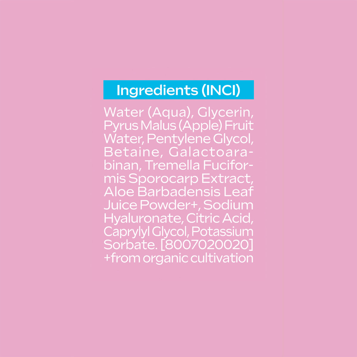 Água (Aqua), Glicerina, Água de Fruta Pyrus Malus (Maçã), Pentilenoglicol, Betaína, Galactoarabinana, Extrato de Esporocarpo de Tremella Fuciformis, Sumo de Folha de Aloe Barbadensis em Pó+, Hialuronato de Sódio, Ácido Cítrico, Caprililglicol, Sorbato de Potássio. [8007020019] +cultivado organicamente