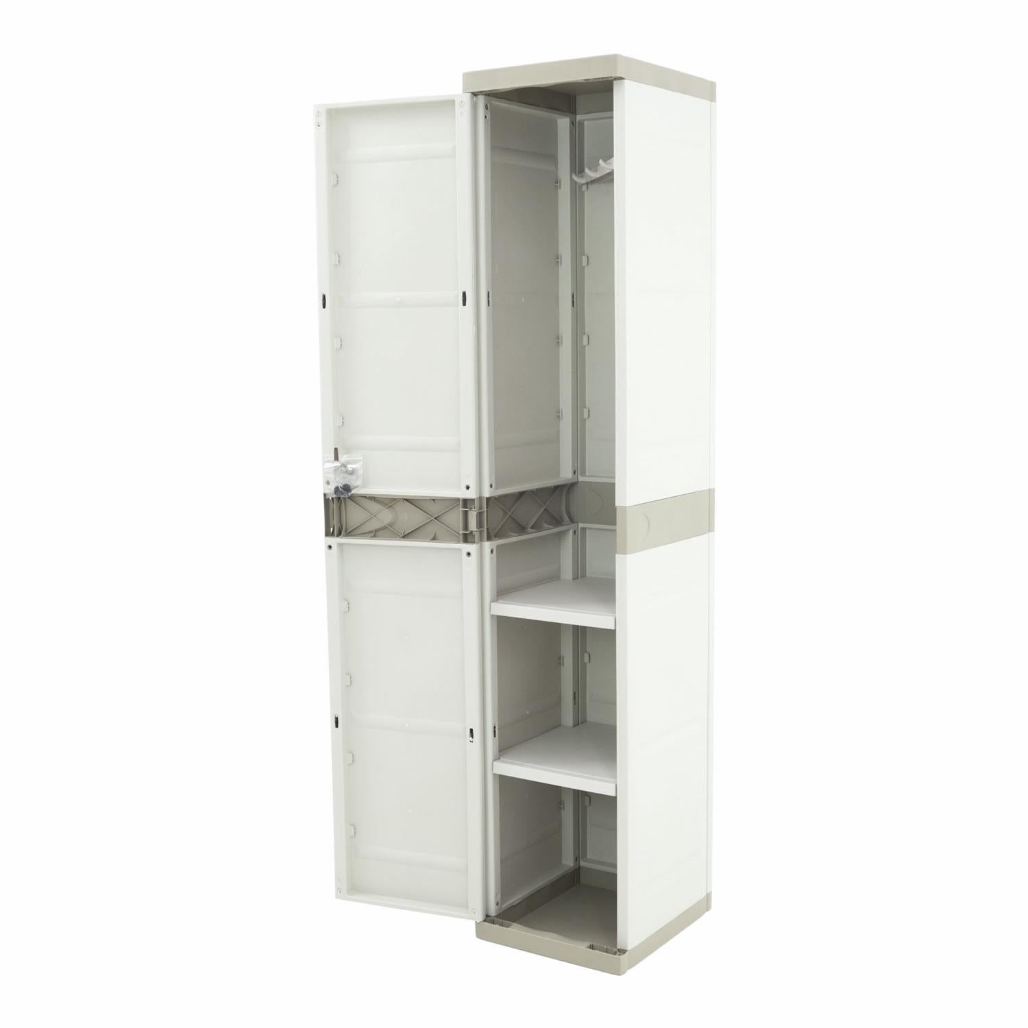 La taquilla de 35 cm es un mueble de almacenaje versátil, diseñado para aprovechar al máximo espacios estrechos. Está fabricada en plástico resistente a los rayos UV, lo que la hace ideal para terrazas, jardines, trasteros, garajes, piscinas o galerías. Cuenta con una puerta con cerradura y llave, y dos estantes regulables que se adaptan a diferentes tipos de objetos.