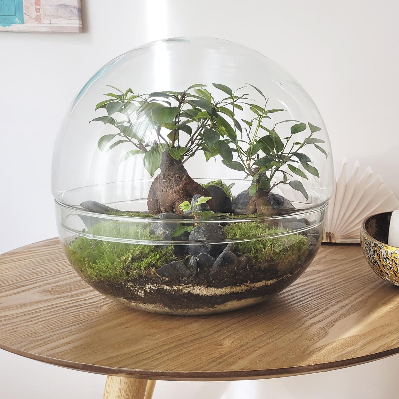 Este terrário contém duas Ficus Retusa como plantas principais, para além de outras plantas secundárias, musgo, cascalho, pedras decorativas e um substrato especial. É enviado de forma completa e exclusiva, feito pelos nossos artesãos, juntamente com um guia de cuidados.