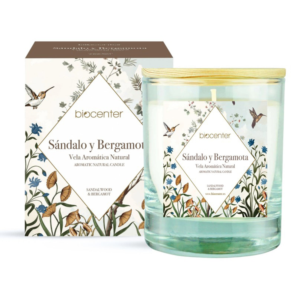 Vela perfumada de SÂNDALO E BERGAMOTA . Aroma intenso, com notas de bergamota que despertam alegria e vitalidade, e de sândalo, que nos convidam à aventura de seguir o próprio instinto. Promove o foco e o entusiasmo. As velas perfumadas Biocenter, feitas com uma mistura preciosa de cera vegetal 100% natural e óleos essenciais, são perfeitas para criar uma atmosfera agradável e acolhedora, evocando memórias e experiências, além de as gerar. Uma vela natural de longa duração (40 horas), num frasco de vidro de alta qualidade e caixa elegantemente decorada.