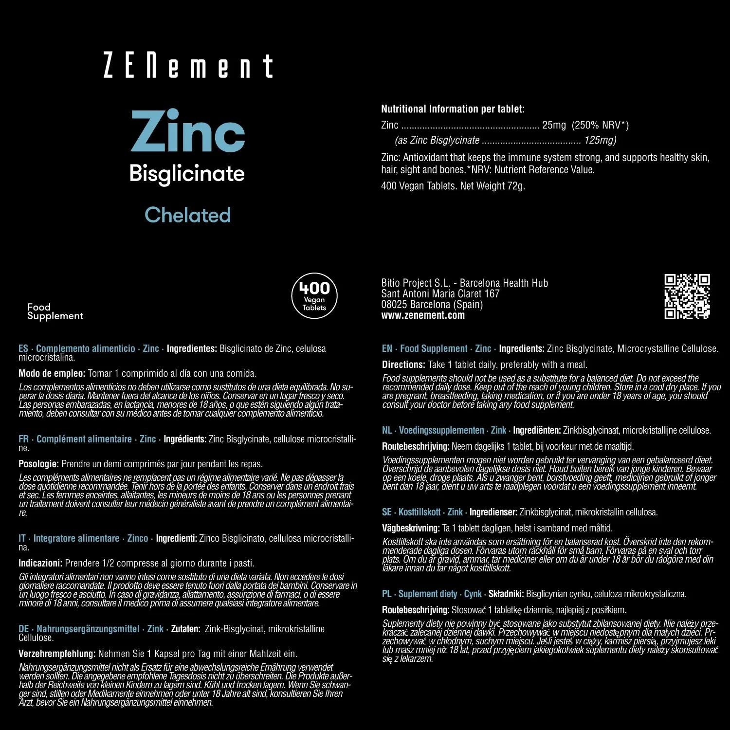 Toda a informação sobre "Zinco 25 mg (bisglicinato) alta dosagem zenement 400 comprimidos"